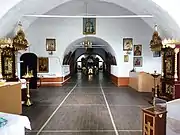 В інтер'єрі панують центральна баня і багатоярусний різьблений з липи іконостас 18 століття (створений, як вважають, за участю архітектора Растреллі). Образи (1753) в іконостасі написані у стилі бароко. Складається він з 50 (було 80) автентичних ікон. Ікони писав Григорій Стеценко, різьбу виконав Сисой Шалматов.
