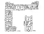 - Ліве (західне) крило — вулиця Кафедральна, 17 — збудоване в XV—XVI століттях. На північно-західному куті — похилий чотиригранний ризаліт із внутрішньою кімнатою і маленьким вікном зверху. У цокольному поверсі цієї частини були знайдені елементи, які дозволили зробити висновок, що ця частина будівлі містить рештки будівлі зламу XIV—XV століть. Розмір використаної цегли — (29-30) х (8-9) х (14-15) см[7].
