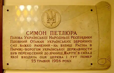 Історія церкви пов'язана також з іменем Симона Петлюри, який помер 25 травня 1926 року, після смертельного поранення, в лікарні «Шаріте», де тепер знаходиться український собор. В церкві знаходяться дві таблиці українською і французькою мовами, які сповіщають про цей факт.