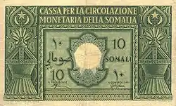 Емісія сомало проводилася заснованою 8 квітня 1950 року Касою грошового обігу Сомалі, яка перебувала в Римі. Емісія почалася 18 квітня того ж року. 6 квітня 1959 року Каса грошового обігу Сомалі переведена з Риму до Могадішо.