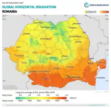 Румунія розташована в районі з високим потенціалом сонячної енергетики — 210 сонячних днів на рік і середньорічний потік сонячної енергії в діапазоні від 1000 кВт*год/м2/рік і 1300 кВт*год/м2/рік. З цієї загальної суми приблизно від 600 до 800 квт*год/м2/рік технічно доступні[3]. Найбільш перспективними для сонячної енергетики регіонами Румунії є чорноморське узбережжя, Добруджа і Олтенія, де середньорічний потік становить 1600 квт*год/м2/рік[4].