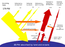Сонячне випромінювання поглинається поверхнею суходолу, океанами (покривають близько 71 % поверхні земної кулі) і атмосферою. Абсорбція сонячної енергії через атмосферну конвекцію, випаровування і конденсацію водяної пари є рушійною силою кругообігу води та керує вітрами. Сонячне проміння абсорбоване океаном та суходолом підтримує середню температуру на поверхні Землі, що нині становить 14 °C[4]. Завдяки фотосинтезу рослин, сонячна енергія