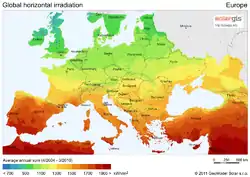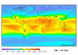 Загальна кількість сонячної енергії, яку поглинає атмосфера, поверхня суходолу і океани становить приблизно 3 850 000 ексаджоулів (ЕДж) на рік[6]. За одну годину, це дає більше енергії, ніж увесь світ використав за цілий 2002 рік[7][8]. Фотосинтез забирає близько 3 000 ЕДж на рік на виробництво біомаси[9]. Кількість сонячної енергії, яка досягає поверхню землі така велика, що за рік вона приблизно вдвічі перевершить всю енергію, яку потенційно можна виробити зі всіх невідновлюваних джерел: вугілля, нафти, уранових руд[10].