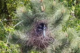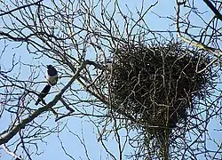 Сороки будують декілька гнізд, «робоче» з яких лише одне. Гнізда кулястої форми, побудовані з гілок. Самиця відкладає 5-8 яєць у квітні-травні, і висиджує їх 17-18 днів[3][2].