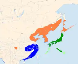 Вид поширений в Східній Азії (північний схід Китаю, Корея, Японія, Далекий Схід Росії, південь Сахалін та Курил). Ізольована популяція населяє гірські райони на південному сході провінції Ганьсу. Японські птахи (крім з острова Хокайдо) не мігрують. З інших місць на зимівлю мігрує на південний схід Китаю. Мешкає у листяних і змішаних лісах, парках і садах.