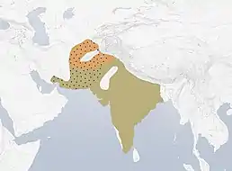 Вид поширений в Індії, Пакистані, Афганістані, на півдні Непалу, сході Ірану, півдні Туркменістану, а також в Омані та ОАЕ. Мешкає у сухих відкритих місцевостях із заростями чагарників.