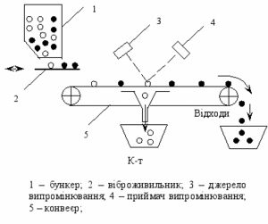 У схемах радіометричного сортування, реєструючи параметри випромінювання (видозміненого) за допомогою приймача випромінювання, отримують інформацію про властивості речовини. Між приймачем випромінювання і блоком виведення порції включають вузол переробки інформації. Для зменшення похибки вимірювання властивостей порції встановлюють фільтрувальні елементи.