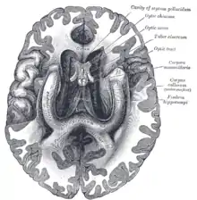 Соскоподібні тіла на коронарному зрізі мозку через внутрішню область третього шлуночка (corpora mamillaria)