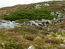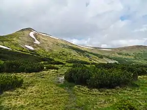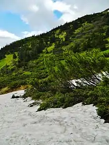 Гірськососнові криволісся в Українських Карпатах становлять північно-східну частину природного ареалу гірської сосни і трапляються в Чивчинських і Мармароських горах, а найбільше — в Ґорґанах і на Чорногорі. Сланкі зарості з домінуванням сосни гірської є найбільш характерною рослинною формацією субальпійського поясу. На Чорногорі, найвищому гірському масиві Українських Карпат, субальпійська рослинність займає значні площі. На північному макросхилі тут простежується широка, майже суцільна смуга криволісь, що простягається від Говерли до Попа Івана. На південному макросхилі зарості сосни більше постраждали від антропогенного впливу, однак і тут є значні її масиви між Говерлою і Гутин-Томнатеком і на схилах Попа Івана. Дослідження Г. Запаловича (Zapałowicz, 1889)[27], а також Л.Фекете і Т.Блатни (Fekete, Blattny, 1914)[28] дозволяють виділити такі категорії висотного поширення гірської сосни: