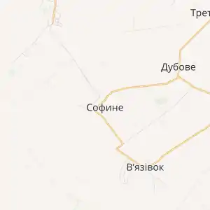 Село Софине знаходиться на відстані 1,5 км від сіл В'язівок та Дубове. По селу протікає пересихаючий струмок з загатою.