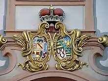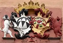 Об’єднання двох гербів відбулося від часів хрестових походів. Тоді кожен герб ділили навпіл і з’єднували їх половинки в новому щиті («розщеплення» щита). Це об’єднання є монограмматичним об’єднанням (герби, з’єднані між собою). Зазвичай два герби входять у два поля у звуженому вигляді, але там також було багато половинних фігур, наприклад, наполовину лев, наполовину орел. Напівгеральдичні тварини на розриві, зокрема орел, пропонують об'єднання гербів .