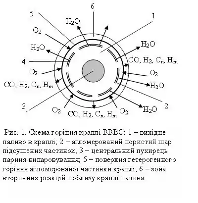 Масоперенос водяної пари від поверхні випаровування вологи в зовнішнє середовище спрямований протилежно тепловому потоку із зон горіння 5 і 6 до поверхні випаровування 4, що істотно гальмує проникнення теплоти до поверхні випаровування і стримує у часі процес випаровування вологи палива. Це стимулює збільшення тривалості паралельного протікання процесів горіння палива і випаровування вологи. Бульбашка пари 3, що утворюється при нагріванні палива у краплі до температури випаровування, у міру прогрівання маси краплі збільшується в обсязі, відтісняючи тим самим масу вихідного палива до поверхні краплі. Кисень повітря, дифундуючи з навколишнього середовища краплі до її зовнішній поверхні, вступає в реакцію з вуглецем твердої фази палива; в результаті утворюється поверхневий шар 5 гетерогенного реагування. У цьому ж шарі взаємодіє з вуглецем і водяна пара. Утворені в результаті гетерогенних реакцій газоподібні продукти згоряння взаємодіють з киснем повітря в зоні вторинних реакцій 6. Процес горіння з розглянутого механізму протікає до моменту повного випаровування вологи палива у краплі. До того часу завершується переміщення частинок твердої фази палива до агломерованого шару, а вугільна частина цього шару вигоряє вже на 70-75% початкової концентрації.