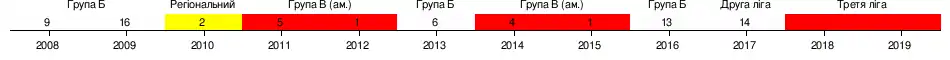 | 2016–17 | II | Друга ліга | 14 | 9 | 6 | 15 | 44 | 52 | 33 | Перший раунд | |