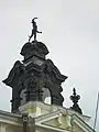 Зображено Меркурія, який уособлював підприємницьку відвагу, ділову спритність, успішну комунікацію. Нині в цій будівлі розміщується дитяча художня школа.