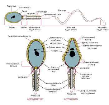 Головка містить гаплоїдне ядро, що містить спадкову інформацію, при цьому під час сперматогенезу гістони, зв'язані з ДНК, заміщуються на протаміни,[2] акросома (спереду від ядра та зразу під плазматичною мембраною), яка містить ферменти для руйнування оболонки яйцеклітини. У шийці знаходиться базальне тіло джгутика, має мітохондрії. Тіло сформоване так званою мітохондріальною спіраллю — комплексом, який складають мітохондрії, хвіст безпосередньо сформований щільними білковими фібрилами та фібрилярним футляром. У комах головка сперматозоїда сильно видовжена, іноді спірально закручена та без помітного виділення тіла переходить у довгий хвіст (джгутик). Переважно цей хвіст займає заднє положення.