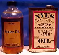 Пляшка і каністра спермацетової олії на виставці в китобійному музеї Нью-Бедфорд (штат Массачусетс, США)