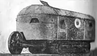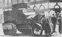 | «Триколіска» | 1915 | 1915—1917 | 18—30 | Також панцирний автомобіль Філатова. Легкі кулеметні і гарматні панцирні автомобілі, побудовані за проектом генерал-майора М. М. Філатова[13][32]. Відмінною особливістю панцирних автомобілів була триколісна ходова частина. Всього було побудовано від 18 до 30 панцирних автомобілів з гарматним або кулеметним озброєнням, кілька розрізнялися конструктивно. Застосовувалися Російською імператорською армією в бойових діях Першої світової війни, також використовувалися в Громадянській війні. | |