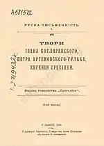 - Твори Івана Котляревского, Петра Артемовского-Гулака, Евгенія Гребінки. — 2-е. — У Львові : Видавництво товариства «Просьвіта», 1908. — Т. I. — 536 с. — (Руска письменність)