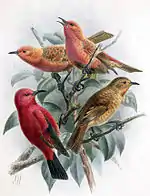 | Квіткарка лайсанська | Himatione fraithii | Rothschild, 1892 | о. Лайсан (Гавайські острови) | 1923 р. | завезення кроликів, що винищили рослинність | ![]() |