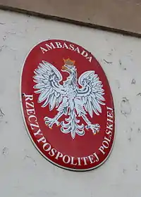 Табличка, яку вішають на будівлі польських посольств.