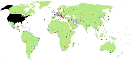 Американські дипломатичні місії, у тому числі посольства (червоні), консульства, консульські офіси (блакитні) та інші представництва (жовті)