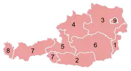 Список замків Австрії наведено за федеральними землями: 1 Бургенланд, 2 Каринтія, 3 Нижня Австрія, 4 Верхня Австрія, 5 Зальцбург, 6 Штирія, 7 Тіроль, 8 Форарльберг, 9 місто Відень