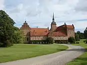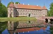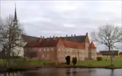 | Розенхольм (дан. Rosenholm Slot) | Замок Розенхольм розташований за 25 км на північний схід від Орхуса поруч з містечком Хорнслет. Його побудував у 1559—1567 роках Йорген Розенкранц (дан. Jørgen Rosenkrantz), член однієї з найвідоміших дворянських родин Данії, ім'я якої Шекспір використав в п'єсі Гамлет. Чотири крила основної будівлі побудовані у 1607 році в стилі Відродження. В 1740-х роках інтер'єр оновили в стилі бароко, а навколо заклали бароковий парк. Замок належить Розенкранцам майже 500 років і є будівлею в Данії, що перебувала у власності однієї родини впродовж найтривалішого часу.[11][12][13] | ![]() |