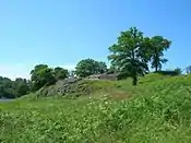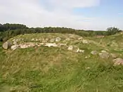 | Кальо (дан. Kalø Slotsruin) | Руїни замку Кальо розташовані за 20 км від Орхуса на вершині невеликого острова в бухті Кальо, який тепер з'єднаний насипом з материком. Замок побудував близько 1313 року данський король Ерік VI, він був однією з декількох фортець, побудованих навколо затоки Орхус для місцевого управління і захисту від іноземних вторгнень. Відомий тим, що у 1518 році тут був ув'язнений Густав Васа. Наприкінці середніх віків замок втратив своє військове призначення, потім й адміністративне, і був розібраний у 1672 році. Комплекс руїн включає декілька могил, валів, замкові ворота і кільця стін.[6][7] | ![]() |