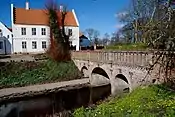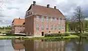 | Енгельсхольм (дан. Engelsholm Slot) | Замок Енгельсхольм розташований в Бредстені (дан. Bredsten) на березі озера. Побудований в стилі доби Відродження під впливом замку Ансі-ле-Фран в Бургундії у 1593 році Кнудом Браге, братом Тихо Браге. Має прямокутну форму з квадратними вежами в кожному з кутів. У 1730-х роках був реконструйований у стилі бароко, вежам були додані куполи, а поруч закладений парк у французькому стилі. У 1952 році замок згорів, але одразу був відновлений. З 1940 року тут діє вища школа мистецтва і музики.[24][25] | ![]() |