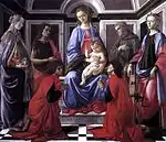 ![]() | Мадонна на троні з чотирма ангелами та шістьма святими | близько 1488 | темпера | 268 x 280 | Уффіці, Флоренція |