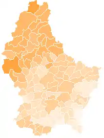 Комуни на карті Люксембурга, темніший відтінок кольору відповідає більшій висоті найвищої точки.