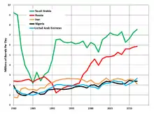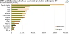 | Місце | Країна | Об'єми експорту (барелів/день) | Рік |