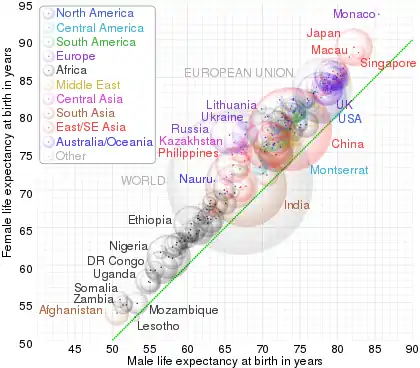 Порівняння середньої тривалості життя жінок та чоловіків, визначеної у довідниках ЦРУ 2013 року, із виділеними мітками. Пунктирна лінія відповідає очікуваній тривалості життя жінок та чоловіків. Удавані тривимірні обсяги бульбашок, лінійно пропорційні кількості населення країни. (У файлі SVG наведіть курсор миші на бульбашку, щоби виділити її та побачити відповідні дані).