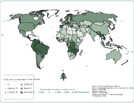 | Країна | Ліси (км2) | Джерело | % площі |