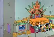 Квік-Е-Март - магазин, власником якого є Апу Нахасапімапетілон. Заклад часто страждає від пограбувань, а власник не обходиться від шахраювання: Апу переписує термін придатності продуктів. Зокрема такий момент був у заставці повнометражного мультфільму "Сімпсони в кіно". «Таверна Мо» Туди ходить Гомер завжди коли має вільний час. В таверні працює чоловік відомий як «Мо»