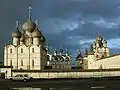 | Ростовський архієрейський двір («Ростовський кремль») | Ярославська область, Ростов Великий | Чудово збережений архітектурний ансамбль, в осн. XVI — XVII ст. Стіни та вежі збудовано в 1670 — 1683 рр[27]. ростовським митрополитом Іоною (Сисоєвичем). | До «кремлівського» двору з двох боків приєднано ділянки слабких мурованих огорож. Мури ж власно «кремля» мають 7 високих веж та дві надбрамні церкви-фортеці. | ![]() |