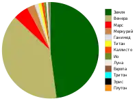 Порівняльна діаграма мас твердих тіл Сонячної системи. Маса Землі становить 48%, Венери - 39%. Тіла масою менше маси Плутона тут не видно.