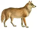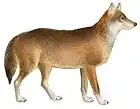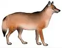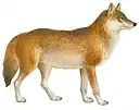 Meyer, 1793 | Собака заввишки 52–60 см і від 117 до 124 см завдовжки. Середня вага від 13 до 20 кг.[13] Колір хутра переважно піщано-червонувато-коричневий, але може включати чорний, світло-коричневий або білий кольори.[14] | Австралія і Нова Гвінея | Dingo antarticus Kerr, 1792 [suppressed ICZN O451:1957], australasiae Desmarest, 1820, australiae Gray, 1826, dingoides Matschie, 1915, macdonnellensis Matschie, 1915, novaehollandiae Voigt, 1831, Dingo papuensis Ramsay, 1879, Dingo tenggerana Kohlbrugge, 1896, hallstromi Troughton, 1957, Dingo harappensis Prashad, 1936 |
