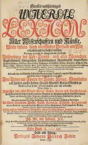 - Großes vollständiges Universal-Lexikon aller Wissenschaften und Künste. (лексикон Цедлєра) (Hrsg. Johann Heinrich Zedler) Halle, 1732—1754. — Bände. 1-64, + 4 Erg.Bde.[15]