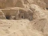 | Начерк наскального рисунка з Гебель-Шейх-Сулеймана, де, ймовірно, згадано ім'я фараона «Слона». | Гробниця U-j, що належала фараону „Скорпіонові“ I (Абідос, Умм ель-Кааб). |