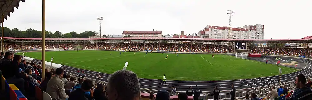 | «Рух» | Івано-Франківськ | 15 000[32] | «Прикарпаття», «Прикарпаття-ДЮСШ №3» | Встановлено 6650 індивідуальних сидінь[33]. Після завершення будівництва стадіон вміщуватиме 20 000 глядачів[34] |