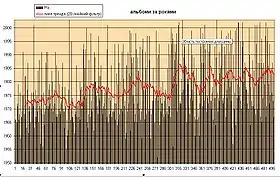 Червона лінія — лінія тренду, що свідчить про переважання більш ранніх альбомів у першій половині списку і пізніших альбомів — в останній