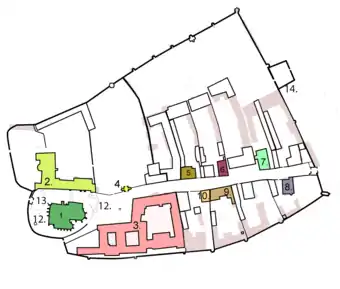 1. Собор св. Мартина, 2. Єпископський палац, 3. Семінарія, 4. Годинникова вежа