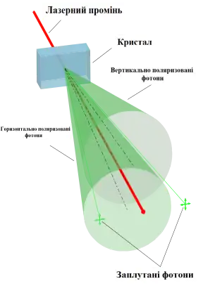 Генерація заплутаних фотонів в результаті спонтанного параметричного розсіяння (СПР) лазерного потоку в нелінійному кристалі.