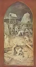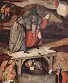 Праворуч зображений Ісус, що впав під вагою хреста і зупинив процесію на Голгофу; Вероніка біжить до Спасителя, щоб витерти піт з його обличчя. Катів це зволікання приводить у ледве стриману лють, інші люди ж дивляться на те, що відбувається швидше з цікавістю дозвільних роззяв, ніж з співчуттям. Трохи нижче розбійники сповідаються монахам у сутанах з відлогами, причому Босх майстерно передає відштовхуючий вигляд цих кліриків.