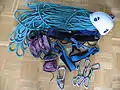 Спортивне спорядження для скелелазіння: мотузка, каска, скельні туфлі, мішечок для магнезії, страхувальна система, відтяжка, карабін