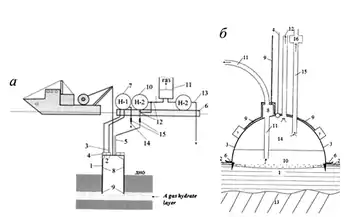 Для розробки газогідратних покладів, що залягають на донній поверхні (іноді під шаром мулу) запропоновані способи, в яких куполоподібний відкритий знизу уловлювач продуктів розкладання газогідратів (УПГР) опускають на тросі з борту плавзасобу на морське дно з газогідратними відкладеннями (рис. 2).