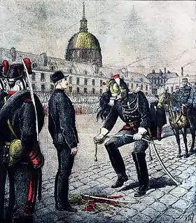 Після винесення вироку відбулася принизлива церемонія публічного розжалування — на площі перед військами та натовпом. Під бій барабанів та звуки труб чотири каноніри з оголеними шашками вивели Дрейфуса, якого одягли у парадну форму та дали шашку. «Останніми» словами капітана Дрейфуса були: «Солдати, клянусь вам — я невинний! Хай живе Франція! Хай живе армія!» Після цього з Дрейфуса зірвали офіцерські нашивки, зламали шпагу та кинули уламки на землю.