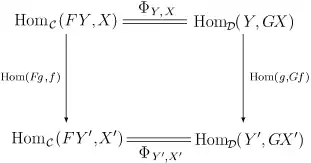 Щоб зрозуміти, що мається на увазі під натуральністю Φ, потрібно пояснити, яким чином homC(F -, -) і homD(-, G -) є функторами. Насправді, вони обидва є біфункторами з Dop×C у Set. В явному вигляді натуральність Φ означає, що для всіх морфізмів f: X → X' у C і морфізма g:Y' → Y у D діаграма нижче комутує: