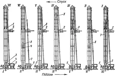 Комплекс механізмів АСП при підйомі бурильної колони зі свердловини виконує операції у такому порядку (рис.).